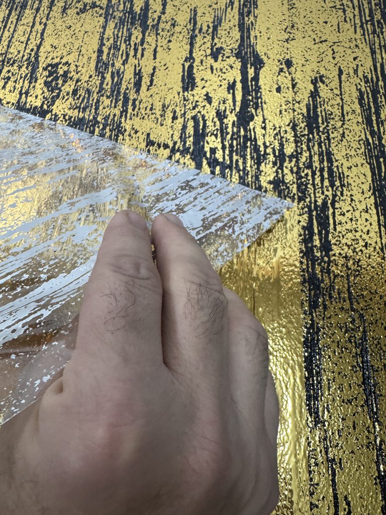 Apply a second layer of adhesive after the first layer has dried (about 2 hours) again with a paint roller and immediately stick the foil on. Each subsequent piece of foil overlaps the previous one by a few millimeters. Press firmly with a short-bristled roller or foil brush.