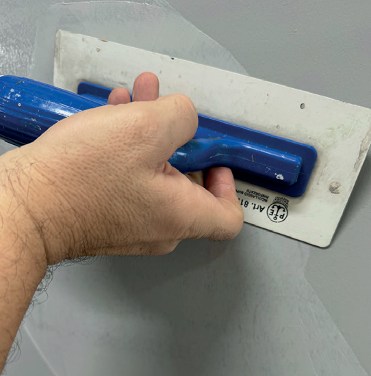 Първият слой се нанася след изсъхване на грунда /от 4 до 6 часа/ с къси повтарящи се движения с маламашка.