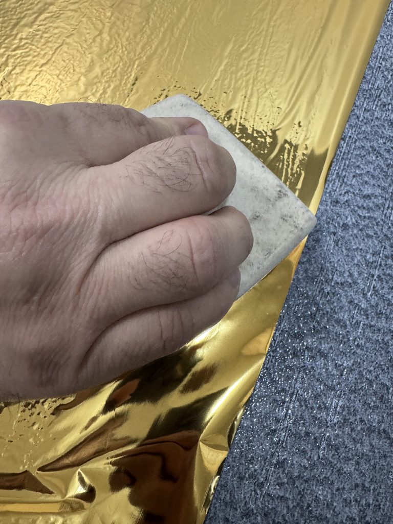 Нанася се втори слой с лепилото след изсъхване на първия (около 2 часа) отново с бояджийски валяк и веднага се залепва фолиото. Всяко следващо парче от фолиото застъпва предишното с няколко милиметра. Притиска се плътно с късокосмест валяк или кече за фолио.