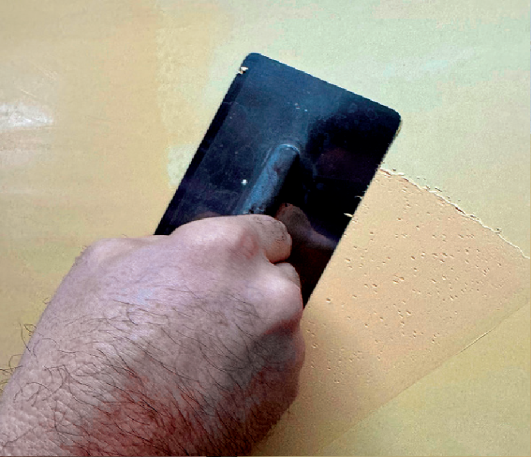 Нанася се в три слоя с помощта на маламашка със заоблени ъгли. Първият слой се нанася след изсъхване на грунда /около 4 часа/ с къси движения и с натиск върху инструмента.